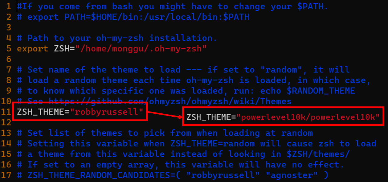 이후, robbyrussell로 설정되어 있는 ZSH_THEME을 powerlevel10k/powerlevel10k로 수정해준 후, 저장하고 파일을 닫아줍시다.