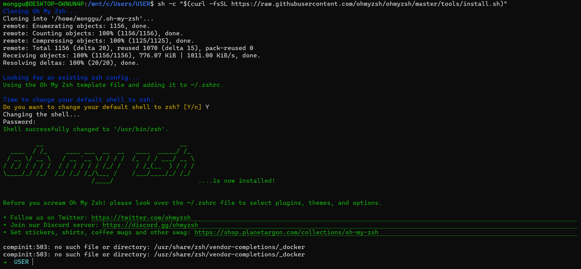 sh -c "$(curl -fsSL https://raw.githubusercontent.com/ohmyzsh/ohmyzsh/master/tools/install.sh)"