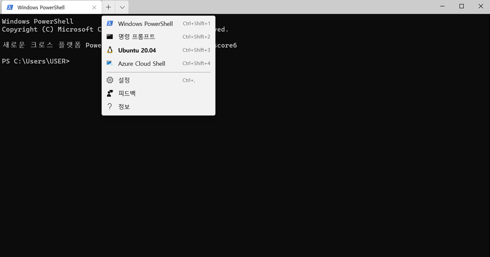 Windows Terminal을 실행시키면 기본 터미널이 Windows PowerShell인 것을 확인하실 수 있습니다. 위 캡처와 같이 ∨ 를 누르셔서 설정을 눌러주세요.