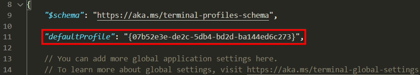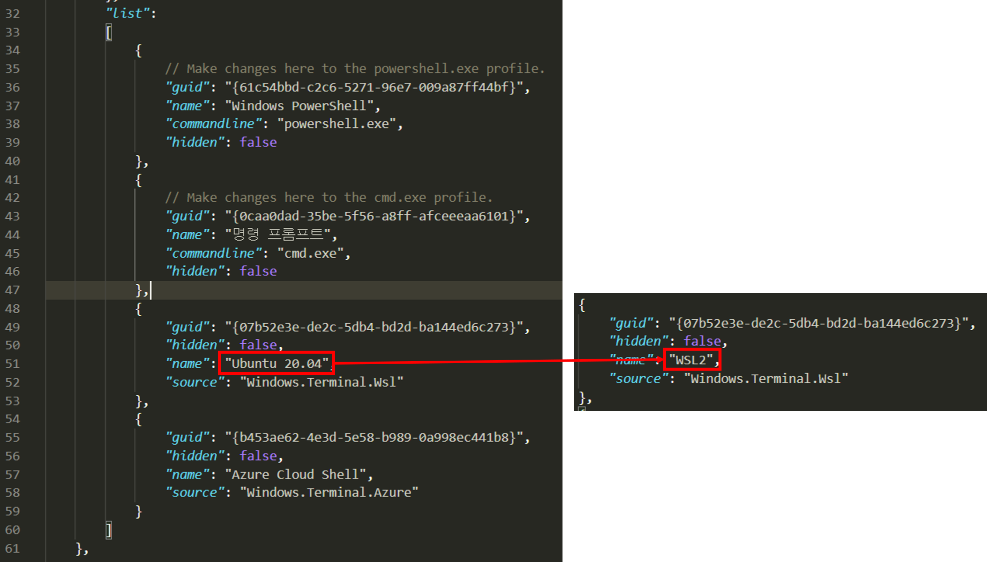 상단의 캡처처럼 settings.json 안에 defaultProfile을 설정하는 key-value 쌍이 존재하는데요. WSL profile 쪽에 기재되어 있는 guid의 value 값을 복사하여 defaultProfile의 value값에 덮어줍시다. 그렇게 되면 Windows Terminal을 실행시킬 때마다 WSL이 기본으로 실행됩니다.