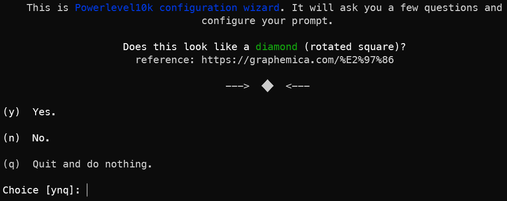 이후 Windows Terminal을 닫아준 후 새로 열어보면 아래와 같이 일련의 질문들이 계속 뜨게 됩니다. 알아서 Powerlevel10K 테마에 적응해주는 과정이니, 보이는 대로 답을 해주시면 됩니다. 여기서 만약 폰트를 적용하지 않았다면 그냥 네모 박스만 계속 뜨실 테니까 꼭 폰트를 설치한 후 적용해주시기 바랍니다!