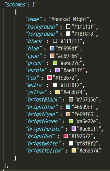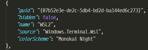 5) settings.json 에서 profile list 중 WSL 쪽으로 가서 colorScheme key를 추가해준 후 value로는 4번에서 지정하거나 이미 쓰여있는 name으로 맞춰서 넣어주기.