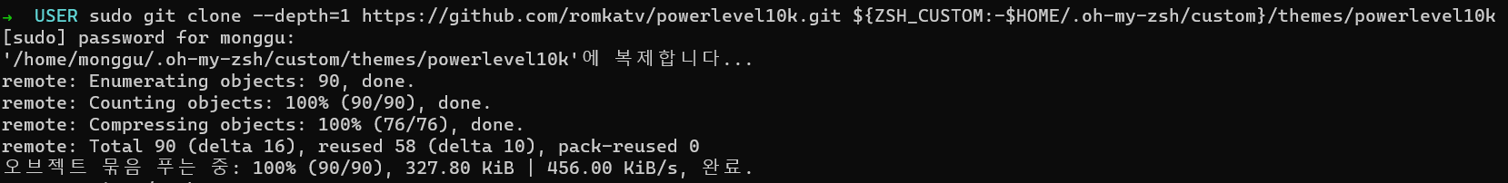 아래 명령어를 통해 oh my zsh 쉘 하위 디렉토리에 powerlevel10k를 클론해줍시다!