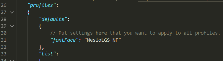 위처럼 settings.json에서 defaults 영역에 "fontFace": "MesloLGS NF" 를 한 줄 추가해주시면 기본 폰트를 설정하실 수 있습니다. 기본 폰트를 설정하게 되면 Windows Terminal에서 키는 모든 터미널(PowerShell, 명령 프롬프트, Azure Cloud Shell, WSL 등)에 폰트가 적용됩니다. 각 터미널에서 적용하고자 한다면 아래 캡처처럼 defaults가 아닌, list 내부에 존재하는 특정 터미널 영역에서 환경 설정을 해주시면 됩니다.