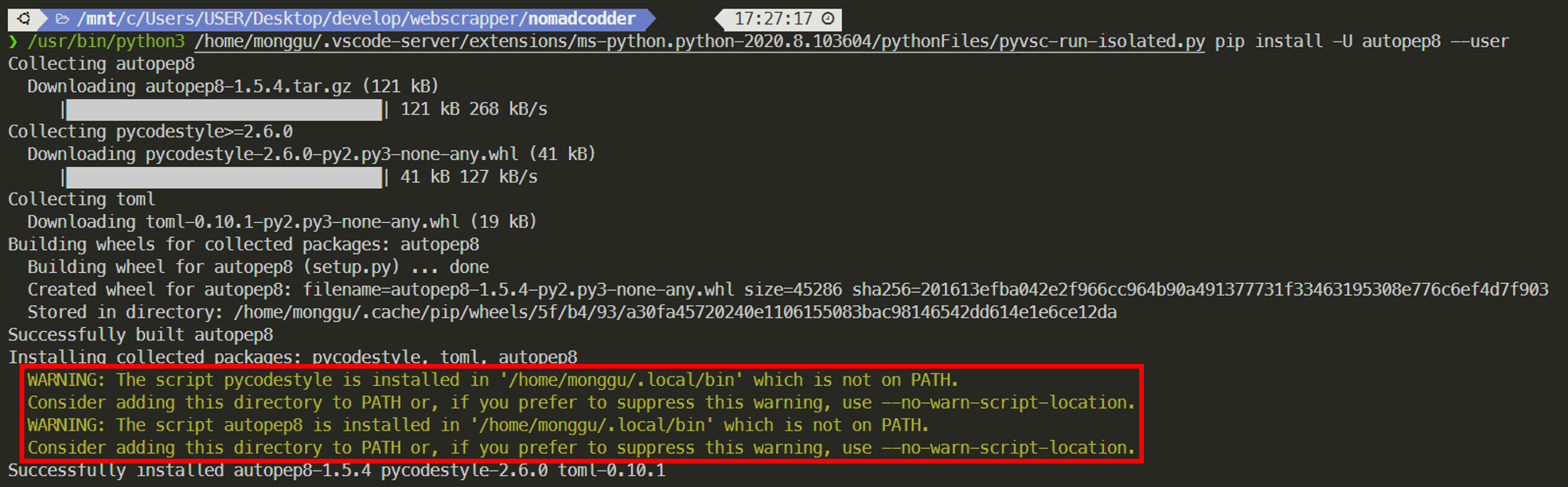WARNING: The script pycodestyle is installed in '/home/monggu/.local/bin' which is not on PATH.