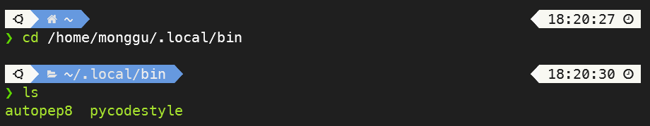 우선 경고 메세지에서 알려준 경로에 실제로 패키지가 설치되었는지 확인해보니 두 패키지가 덩그러니 /home/monggu/.local/bin라는 경로에 설치되어 있네요. zsh가 이 경로를 인식하고 있을까요?