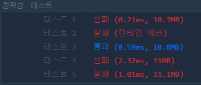 이제서야 '정렬한 후 각 리스트의 원소를 비교하면 되겠구나' 싶었다. 그런데 list index out of range 에러가 발생했다. completion의 원소 개수를 participant와 맞춰줘야겠다 생각하고 세 번째 줄 아래에 completion.append('tmp') 를 추가해줬더니 입출력 예시는 다 통과했다. 하지만 제출해보니 테스트 결과가 처참했다.