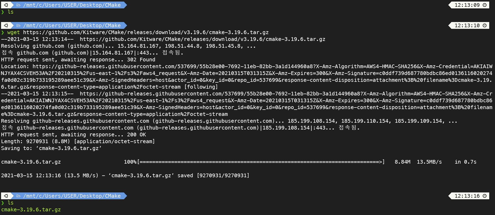 5. 아래 명령어를 순차적으로 실행해줍니다. 압축을 해제한 파일들이 있는 디렉토리로 이동하여 CMake를 빌드하고 설치하는 과정입니다.