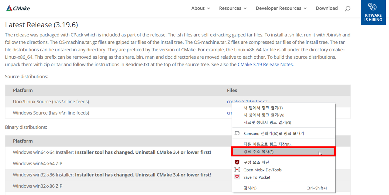 wget https://github.com/Kitware/CMake/releases/download/v3.19.6/cmake-3.19.6.tar.gz