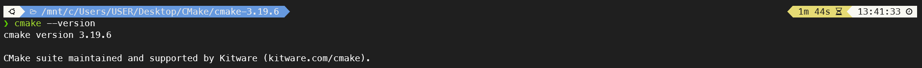 6. 아래 명령어를 통해 정상적으로 cmake가 설치되었는지, 버전은 어떤 것인지 확인해봅시다. 캡처와 같은 결과가 보인다면 정상적으로 해당 버전이 설치된 것입니다. 이제 시스템 전역에서 cmake를 사용하실 수 있습니다.