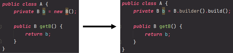 개발 도중 인스턴스 생성 방식을 constructor 대신 builder pattern을 활용하는 방향으로 전환하고, constructor는 사용할 수 없도록 private으로 막아버렸다고 가정해보겠습니다. 아래는 변경된 B 클래스입니다.