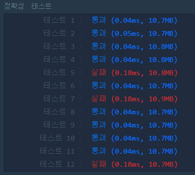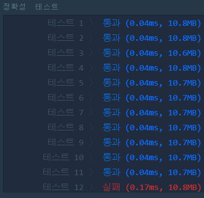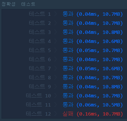 그 결과, 12번 테스트 케이스를 제외하고는 모두 통과했다. 솔직히 테스트 12가 대체 뭐길래 틀리는거지 싶었고, 전혀 감이 오지 않았다. 고민하다가 문제를 다시 봤더니 제한 사항 중 간과하고 있던 게 있었다.