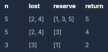 - 여벌 체육복을 가져온 학생이 체육복을 도난당했을 수 있습니다. 이때 이 학생은 체육복을 하나만 도난당했다고 가정하며, 남은 체육복이 하나이기에 다른 학생에게는 체육복을 빌려줄 수 없습니다.