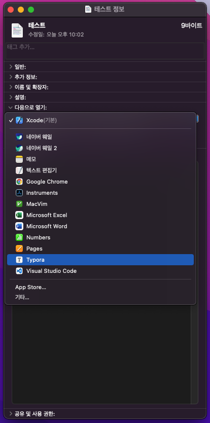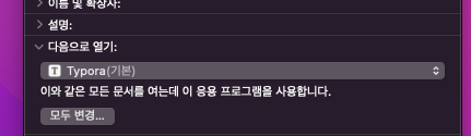 평소에 Typora라는 프로그램으로 md 파일을 보고 있었는데, Xcode를 깔고 난 다음부터 갑자기 모든 md 파일이 Xcode로 열리기 시작했습니다. 파일 우클릭 - 다음으로 열기 - 기타 - 원하는 프로그램 선택 - '항상 선택한 응용 프로그램으로 열기' 체크 를 통해 기본 실행 프로그램이 변경될 줄 알았는데, 해당 파일에 대해서만 기본 실행 프로그램이 변경되더라고요.