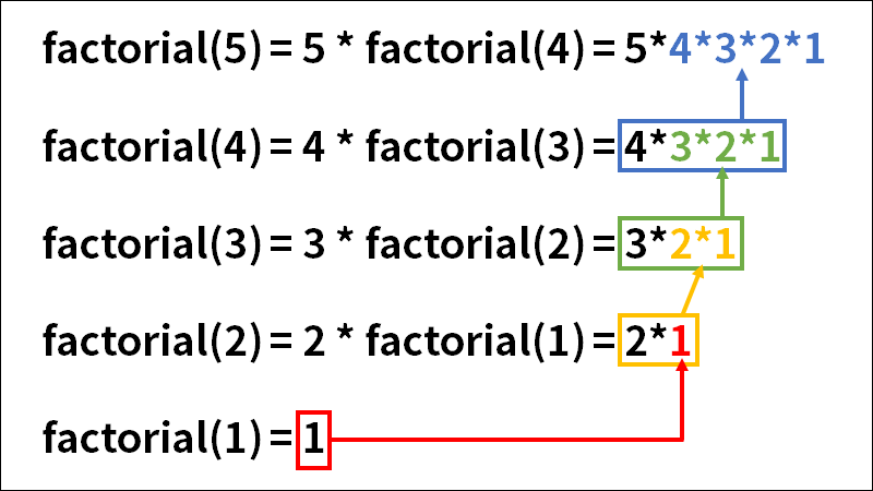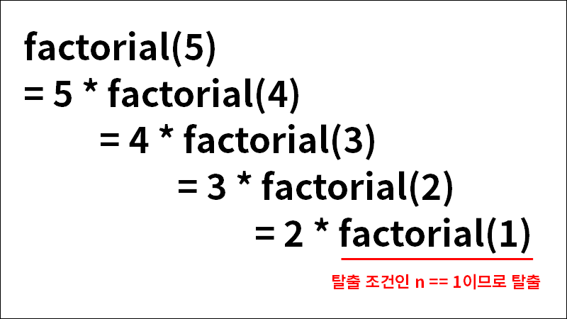 - factorial(2) = 2 * factorial(1)은 이제 factorial(2) = 2 * 1 = 2 라는 것을 알게 되었으며, 자연스럽게 factorial(3)과 factorial(4)의 값을 알 수 있게 되어 factorial(5)의 값까지 알게 된다.