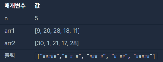입력으로 지도의 한 변 크기 n 과 2개의 정수 배열 arr1, arr2가 들어온다.