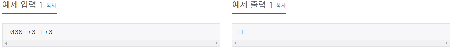 이건 솔직히 수학을 코딩으로 옮겨놨다고 해도 무방하다. 먼저 프로그래밍적으로 접근하기 위해 line 12 ~ line 15처럼 짰었으나, 입력값이 딱 봐도 21억 이하라는 압도적인 숫자여서 바로 실패해버렸다. 그래서 그냥 손익분기점이 되는 지점 n을 line 7에 수식으로 정리했다. 이때 주의할 점은 n이 정수로 떨어질 수도 있고 소수로 나올 수 있는데, 정수라면 n에 +1을, 소수라면 올림을 해주면 된다.