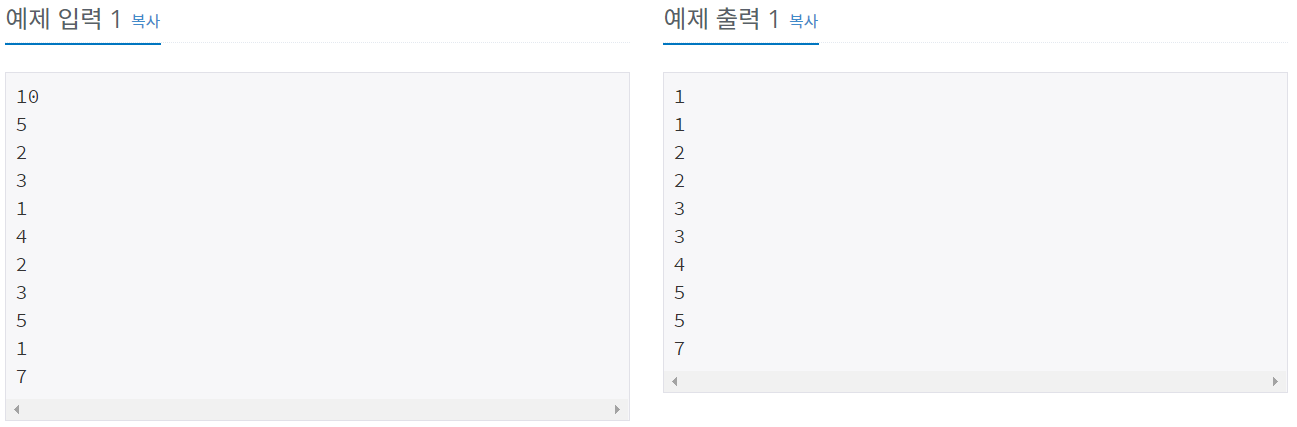 상당히 애를 먹었던 문제인데, 핵심은 메모리도, 시간도 초과하지 않아야 한다는 것이다. 정말 아주 간단하게 구현한다면 입력받는 값들을 리스트에 넣고 정렬하고 출력하는 로직으로 짤 수 있겠지만 그렇게 된다면 시간이 많이 초과하게 될 것이다. 아무튼 라인 바이 라인으로 설명을 해놔야 까먹지 않을 것 같다.