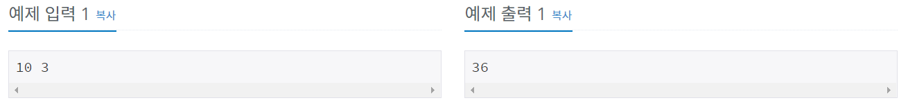 첫째 줄에 두 수 S와 K가 주어진다. K는 20보다 작거나 같고, S는 100보다 작거나 같으며 K보다 크거나 같다.