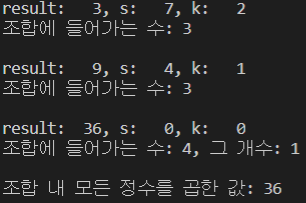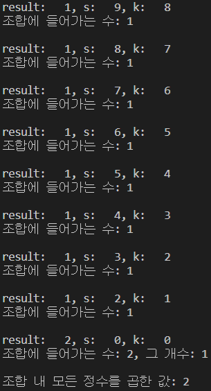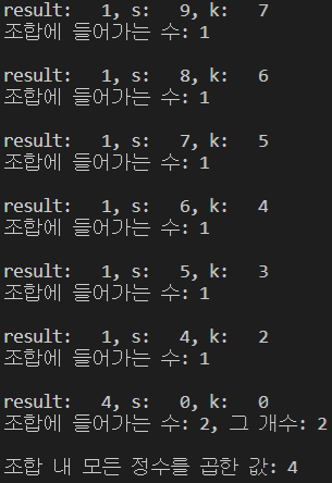 이 while문에서는 k를 계속 뺄 것인데, 만약 남아있는 k가 s의 약수가 아니라면, 조합 내에는 key값을 가진 정수가 하나 추가된다고 생각하자. 그렇게 되면 남은 s는 본래 s에서 key값을 빼야 하고, 조합에 정수를 하나 추가시켰으므로 k도 1을 빼준다.