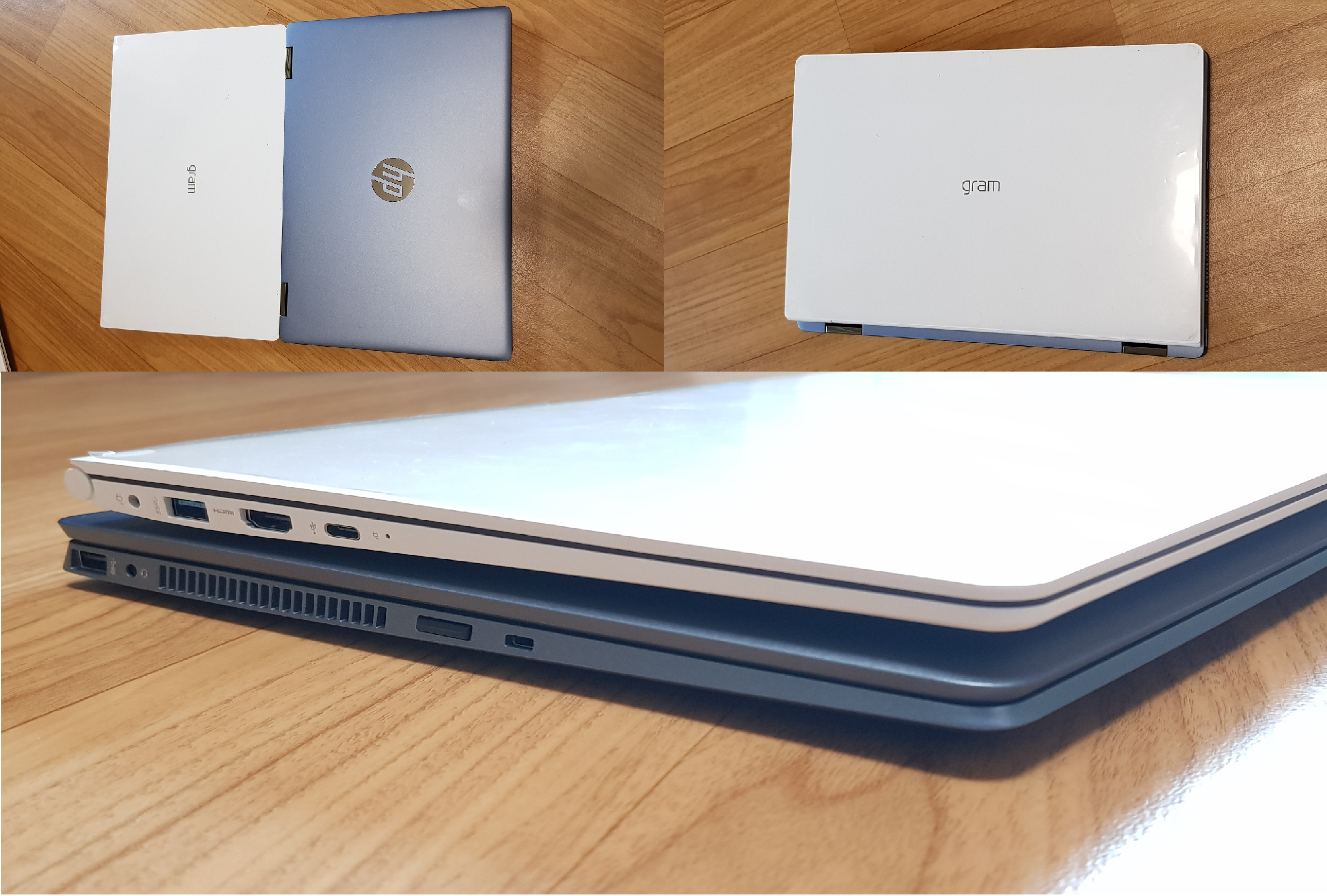 두 번째로는 가족이 사용하고 있는 LG 그램과 비교한 모습입니다. 두 노트북은 디스플레이가 14인치인 것은 동일하지만, 360도 회전을 하기 위한 힌지가 외부로 살짝 나와 있어서 약간 더 커 보이는 느낌이 있습니다. 기기의 스펙을 살펴보면 길이에서 1.09cm 차이가 나는 걸 알 수 있는데, 실제 사용해보니 체감상 그램을 사용했을 때와 차이가 거의 없다고 생각합니다.