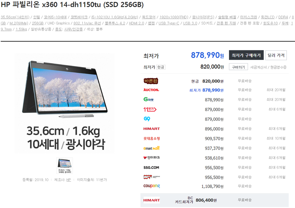 | HP 파빌리온 x360 14-dh1150tu | 32.4 cm x 22.29 cm, 14 inch | 19.7 mm |