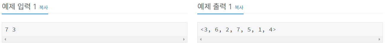 예제와 같이 요세푸스 순열을 출력한다.