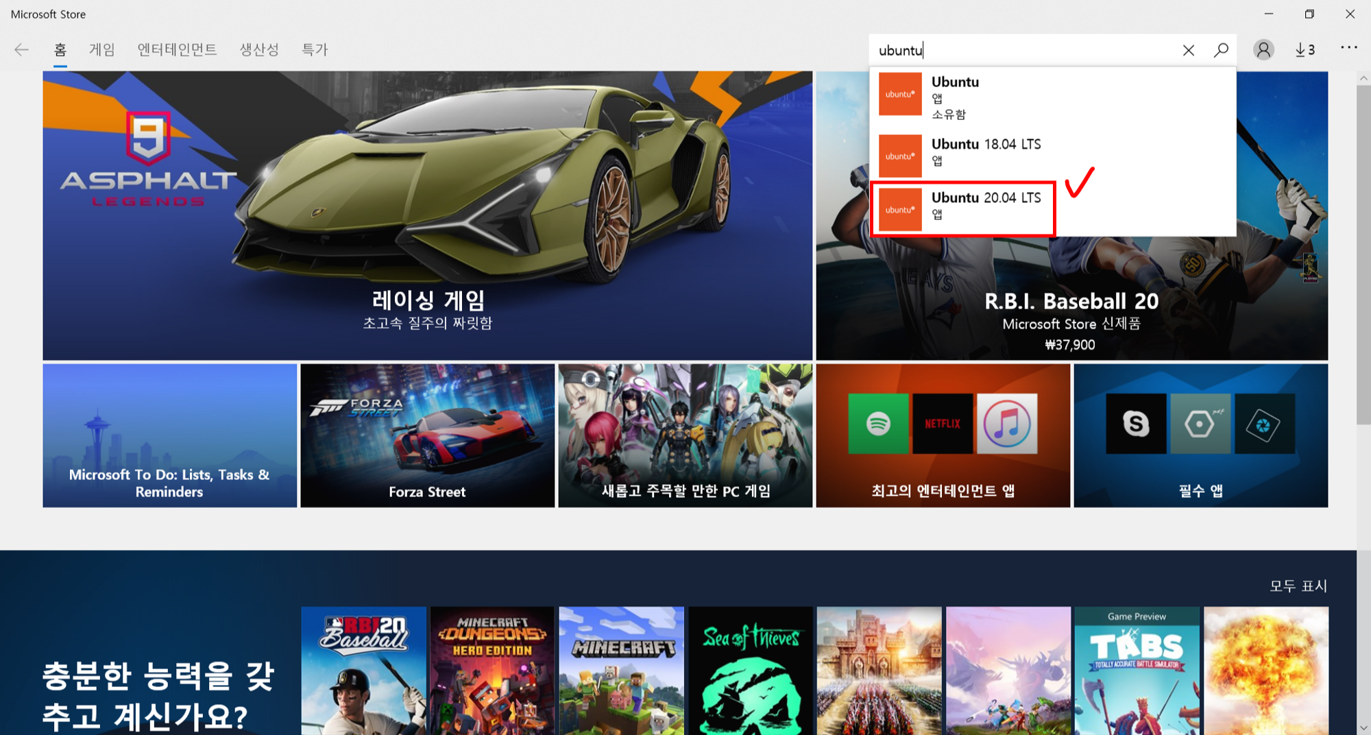 5. Microsoft Store 앱 내부의 우측 상단 검색 아이콘 클릭 → 'ubuntu' 타이핑 → 드랍다운에 보이는 'Ubuntu 20.04 LTS' 클릭