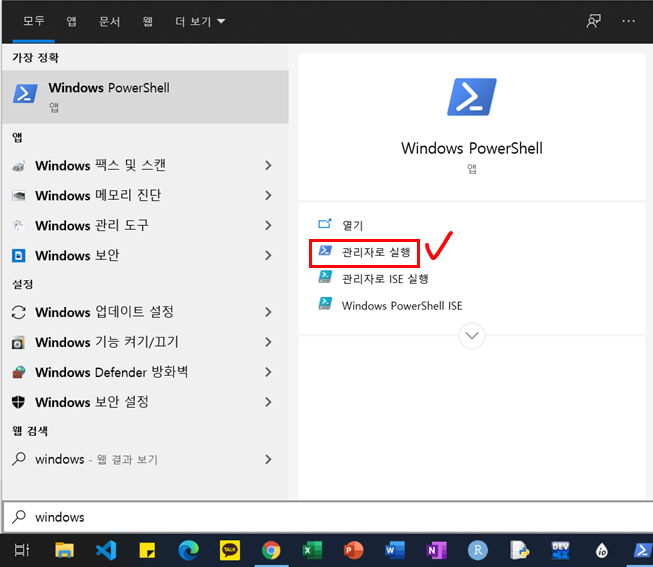 1. 시작 → 'windows powershell' 검색 → 'Windows PowerShell' 앱을 관리자로 실행