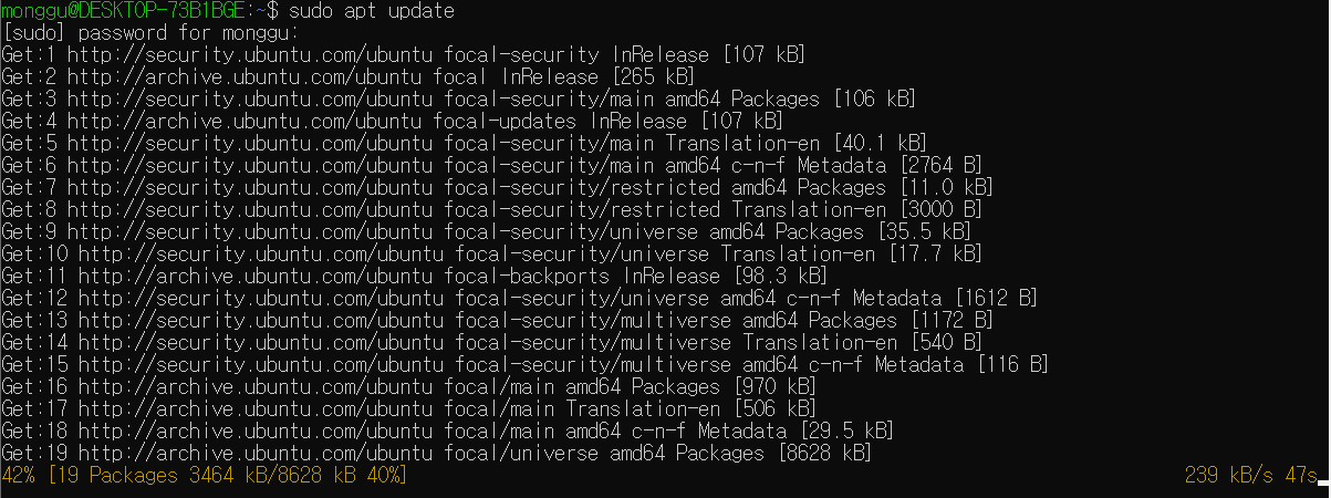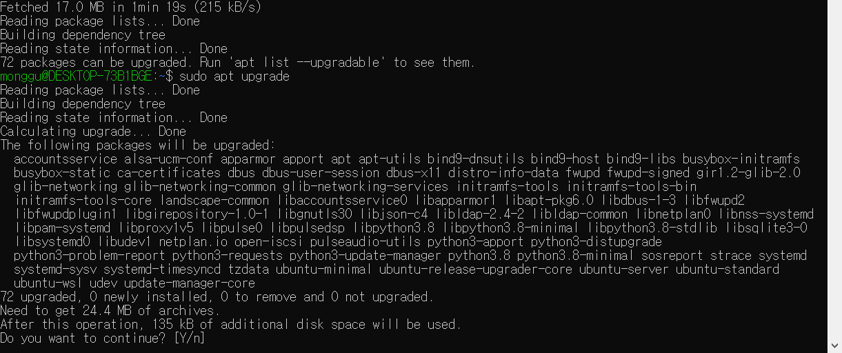 sudo apt update 명령어를 수행하기 위해서 비밀번호를 요구하는데 아까 설정한 비밀번호를 입력하면 되며, sudo apt upgrade 명령어를 수행할 때 'Do you want to continue?'라고 뜨면 엔터.