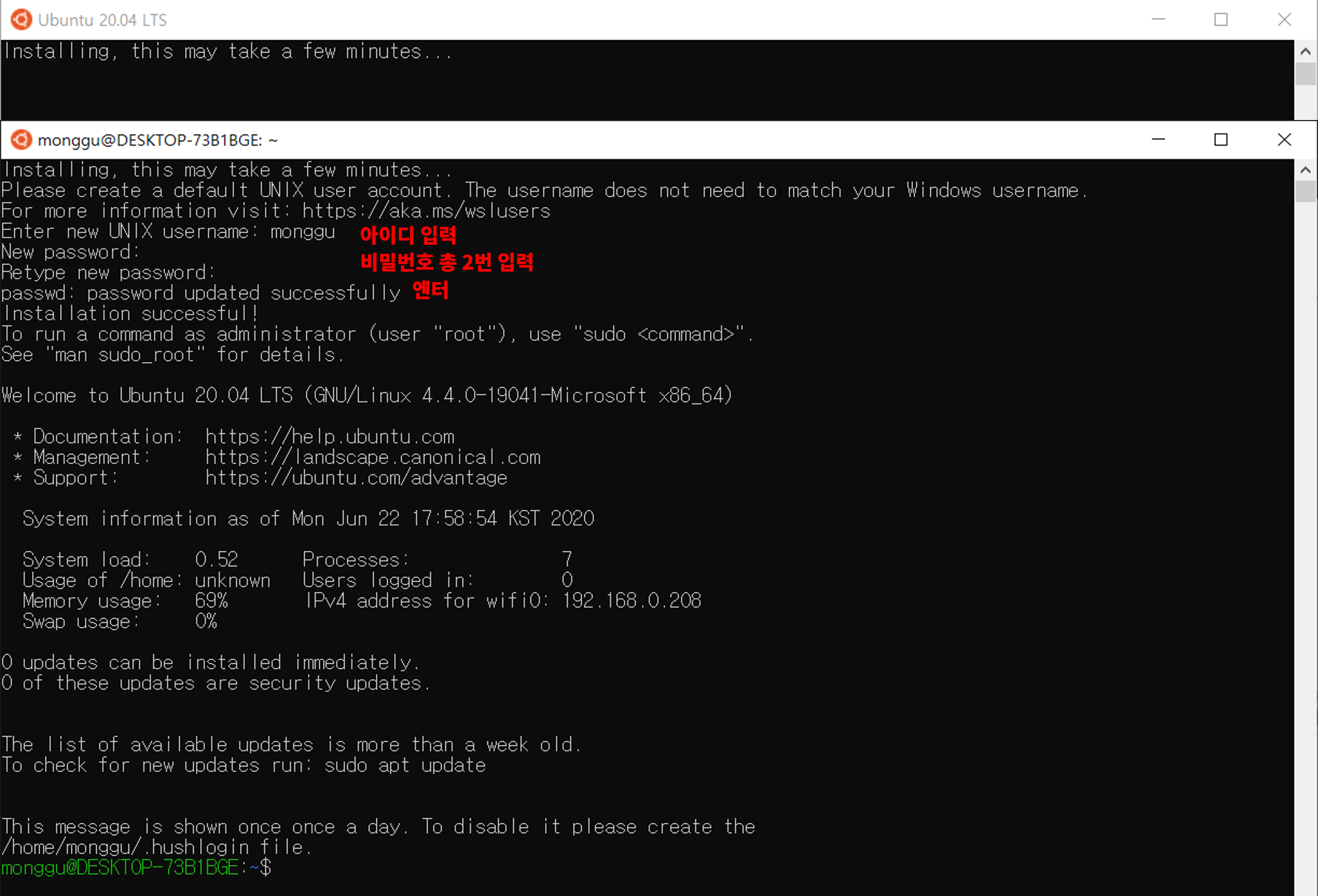 비밀번호를 확인하는 절차까지 총 비밀번호를 2번 입력하면 엔터.