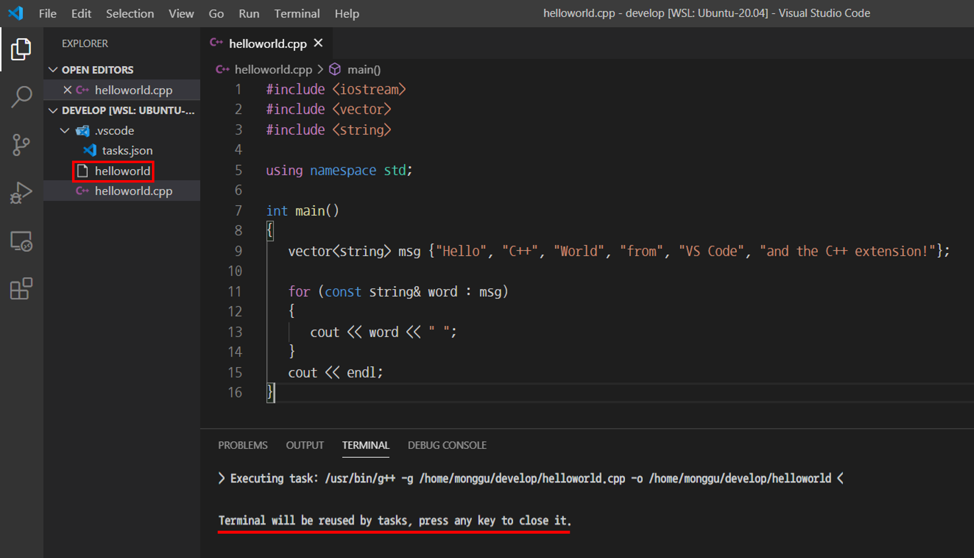 빌드가 정상적으로 완료되면 아래 그림과 같이 터미널에 "Terminal will be reused by tasks, press any key to close it."라는 문구가 뜨며, 해당 디렉토리에 컴파일된 실행 파일이 생성된다.