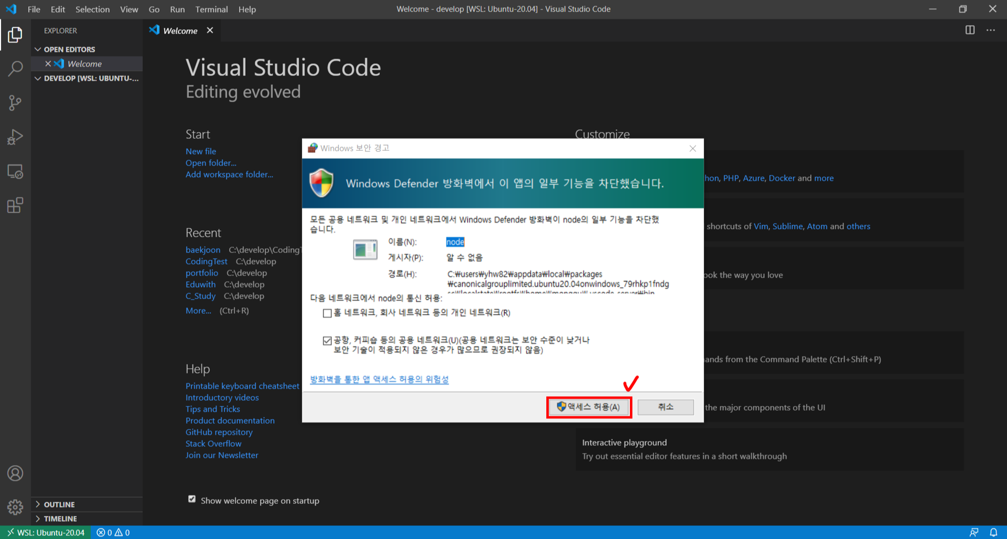 3. 설치 완료 후 VS Code가 실행되고, 보안 경고가 하나 뜨는데 액세스 허용을 클릭.