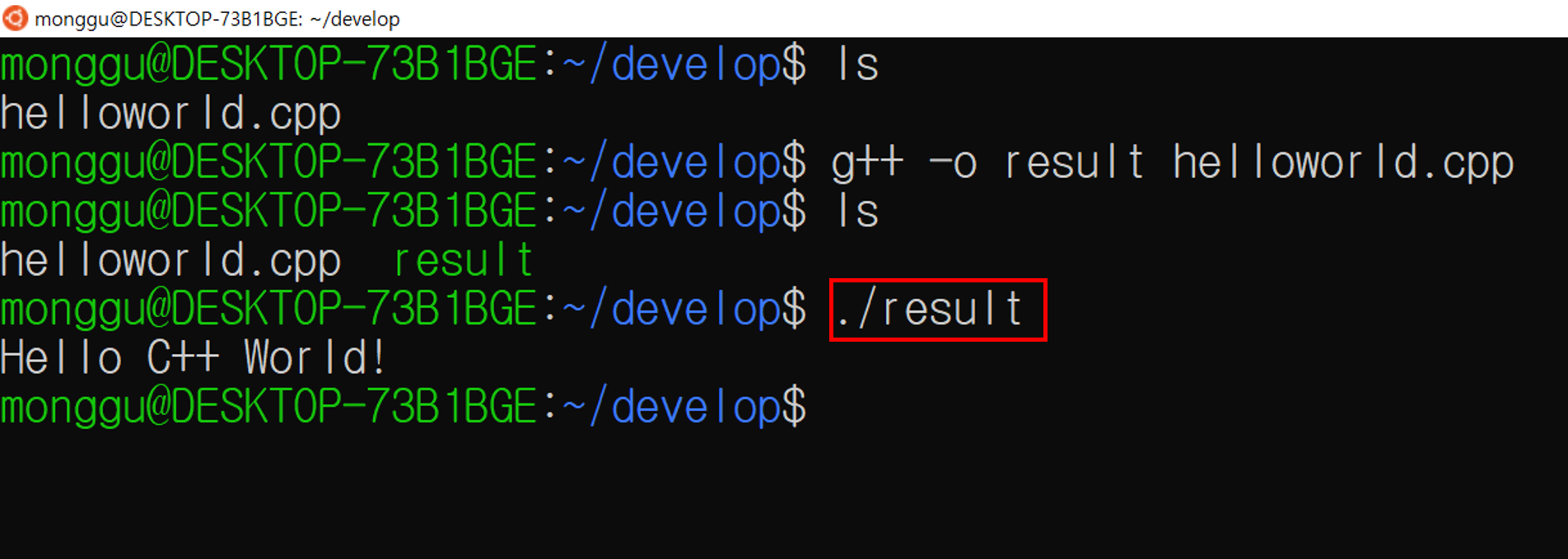 # g++ -o (컴파일 한 결과의 파일명) (컴파일 할 소스코드의 파일명.확장자명)