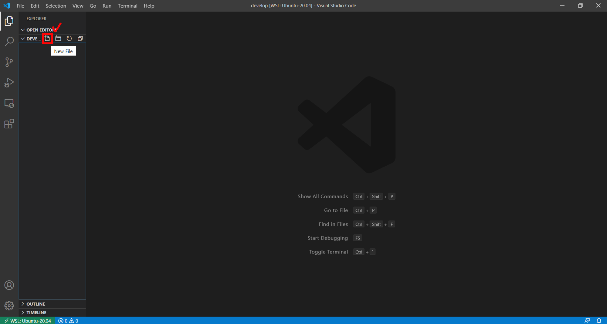 2. VS Code에서 설치한 플러그인을 적용하기 위해 우분투 창을 종료시켰다가 재실행. 이후 새롭게 생성한 디렉토리에서 아래 명령어를 수행. 해당 명령어는 우분투 내에서 VS Code를 실행하는 명령언데, VS Code가 없기 때문에 설치를 먼저 하게 된다.