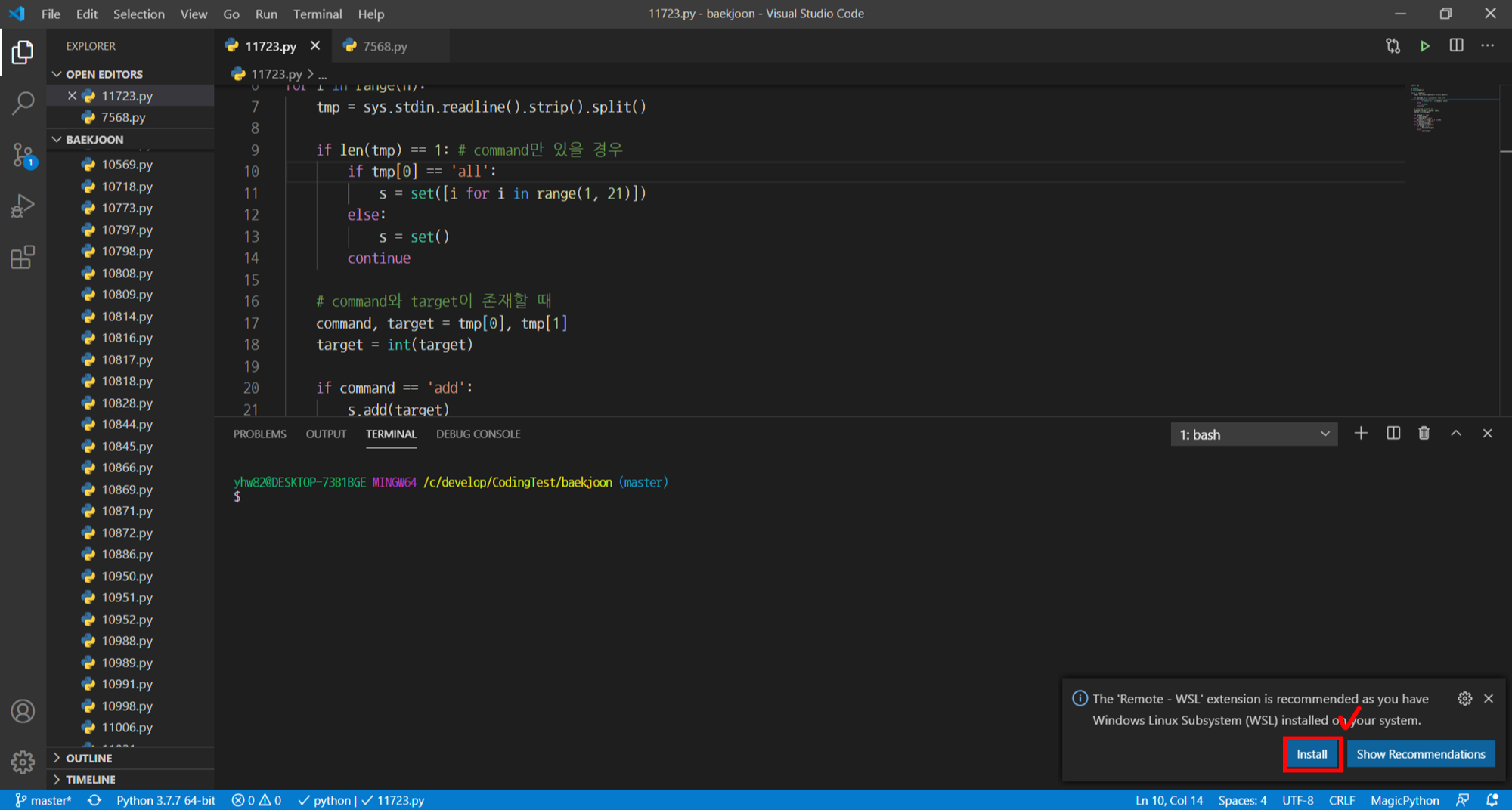 1. 우분투 설치 이후 Windows에서 VS Code를 실행하면 우측 하단에 사진과 같이 팝업이 뜬다. Install을 클릭.