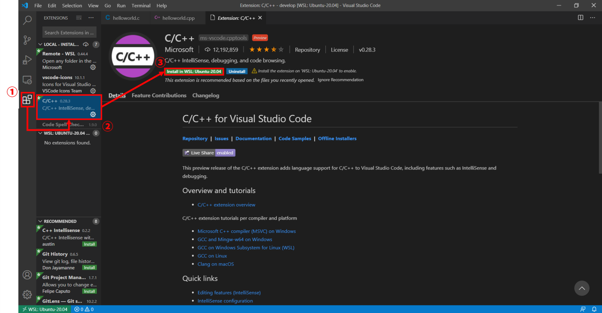 만약 기존에 Windows에서 VS Code를 이용했었고 C/C++ Extensions을 설치해놨다면 'Install' 버튼 대신 'Install in WSL: Ubuntu-20.04'이 존재할 것이다. 그것을 클릭하여 우분투 내에 'C/C++' Extension을 설치하고, 설치해준 뒤에는 'Reload Required' 버튼을 클릭하여 VS Code를 재실행해주자. (아래 그림 참고)