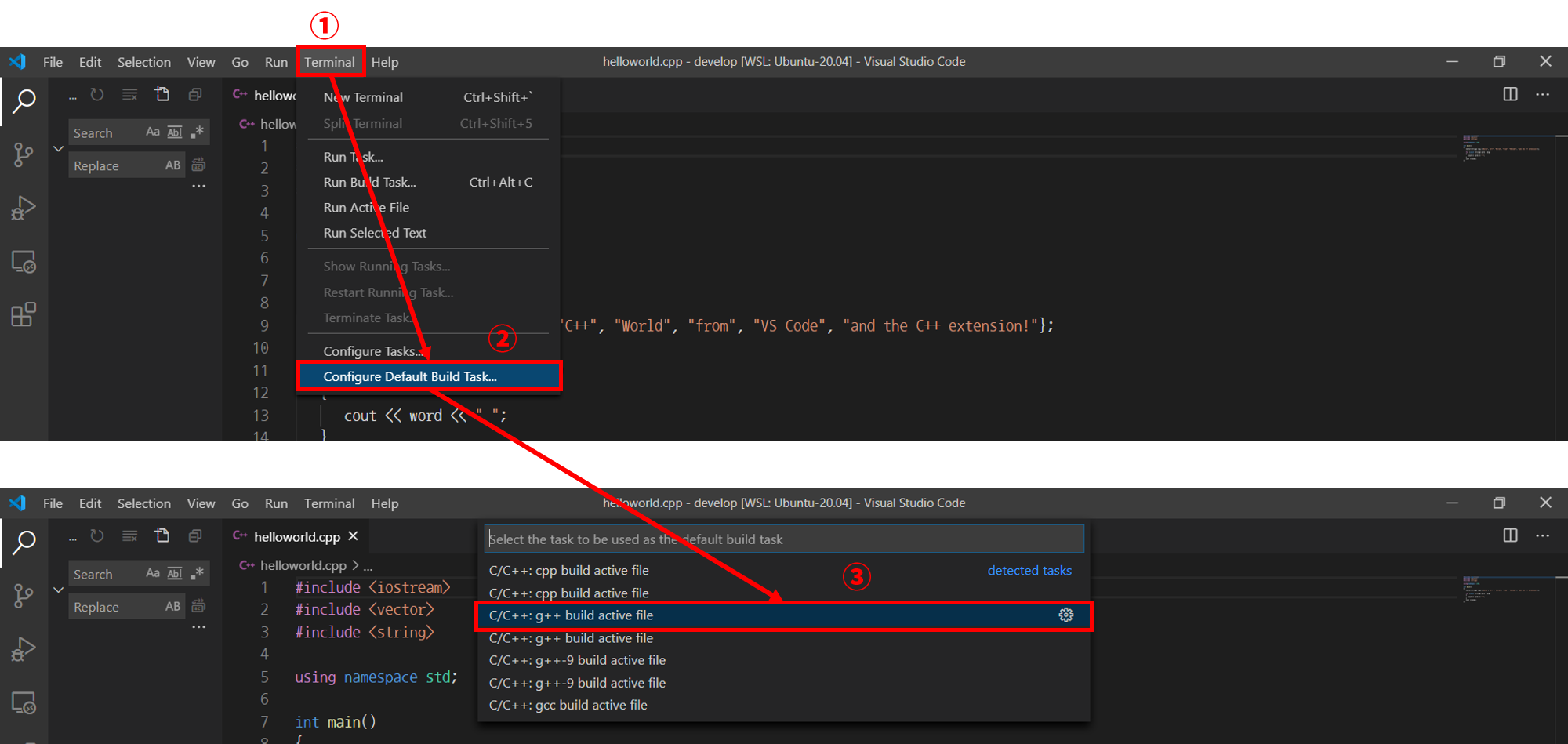 Terminal - Configure Default Build Task - C/C++ : g++ build active file (아래 그림 참고)